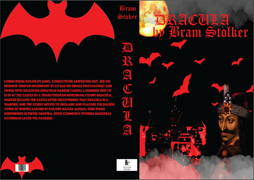 This are my finale products of my back cover, spine and front cover i have went with this team because it about Dracula and Dracula is a vampire. I went on with out a plan I did it this way because i was thinking that the red will be like blood that vampires go crazy over it. I went on Photoshop and first I have done the front cover to make it I took an image of Vladimir the impaler to add him and then i took the castle that he was living in at the time then i have took a moon to put on top left of the front cover that is the only object. The spine has the publishers logo the name of the book and the author. The back of it is made wi two bats i got from google an bar code and that is. I think it turned ok but i could of done a better one if i would change the back writing with the blurb with is about the book and the story and one more thing could be on the front cover on the top it could be more down to be able to read better.